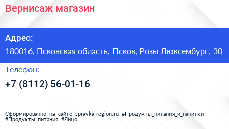 Вернисаж, магазин по адресу 180016, Псковская область, Псков, Розы Люксембург, 30 в дальнейшем Организация, размещена в следующих категориях: