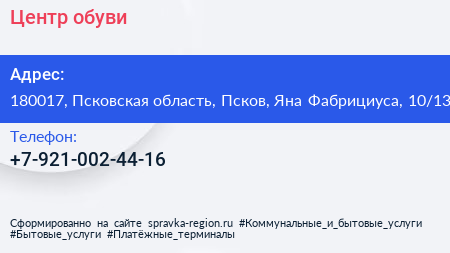 Центр обуви по адресу 180017, Псковская область, Псков, Яна Фабрициуса, 10/13 в дальнейшем Организация, размещена в следующих категориях:
