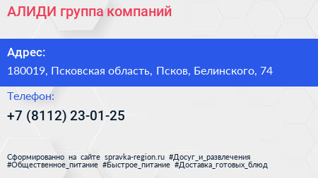 АЛИДИ, группа компаний по адресу 180019, Псковская область, Псков, Белинского, 74 в дальнейшем Организация, размещена в следующих категориях:
