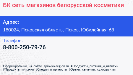 БК, сеть магазинов белорусской косметики по адресу 180024, Псковская область, Псков, Юбилейная, 68 в дальнейшем Организация, размещена в следующих категориях: