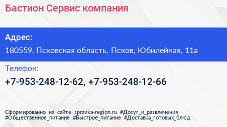 Бастион-Сервис, компания по адресу 180559, Псковская область, Псков, Юбилейная, 11а в дальнейшем Организация, размещена в следующих категориях: