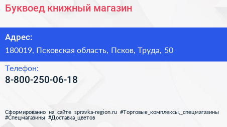 Буквоед, книжный магазин по адресу 180019, Псковская область, Псков, Труда, 50 в дальнейшем Организация, размещена в следующих категориях: