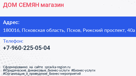 ДОМ СЕМЯН, магазин по адресу 180016, Псковская область, Псков, Рижский проспект, 40а в дальнейшем Организация, размещена в следующих категориях: