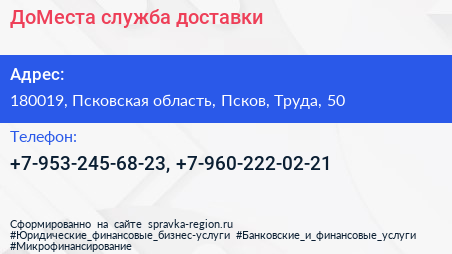 ДоМеста, служба доставки по адресу 180019, Псковская область, Псков, Труда, 50 в дальнейшем Организация, размещена в следующих категориях:
