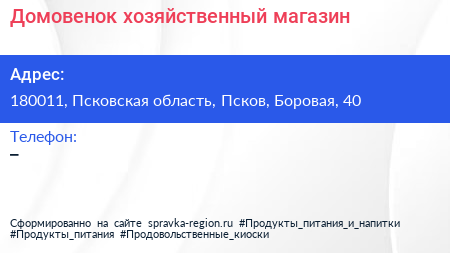 Домовенок, хозяйственный магазин по адресу 180011, Псковская область, Псков, Боровая, 40 в дальнейшем Организация, размещена в следующих категориях: