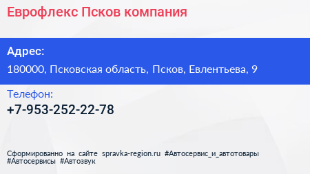 Еврофлекс Псков, компания по адресу 180000, Псковская область, Псков, Евлентьева, 9 в дальнейшем Организация, размещена в следующих категориях: