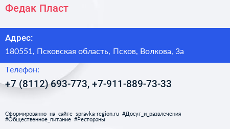 Федак-Пласт по адресу 180551, Псковская область, Псков, Волкова, 3а в дальнейшем Организация, размещена в следующих категориях:
