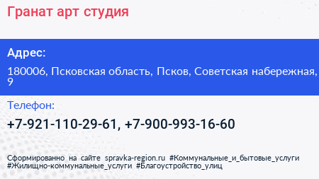 Гранат, арт-студия по адресу 180006, Псковская область, Псков, Советская набережная, 9 в дальнейшем Организация, размещена в следующих категориях: