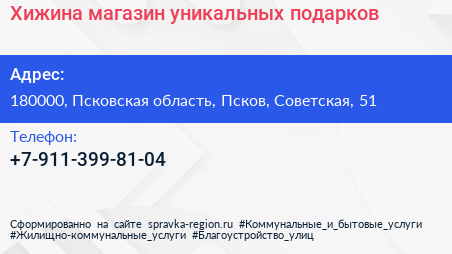 Хижина, магазин уникальных подарков по адресу 180000, Псковская область, Псков, Советская, 51 в дальнейшем Организация, размещена в следующих категориях: