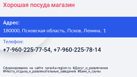 Хорошая посуда, магазин по адресу 180000, Псковская область, Псков, Ленина, 1 в дальнейшем Организация, размещена в следующих категориях: