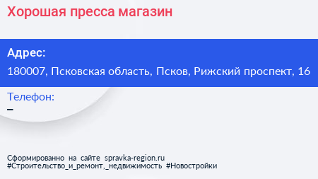 Хорошая пресса, магазин по адресу 180007, Псковская область, Псков, Рижский проспект, 16 в дальнейшем Организация, размещена в следующих категориях:
