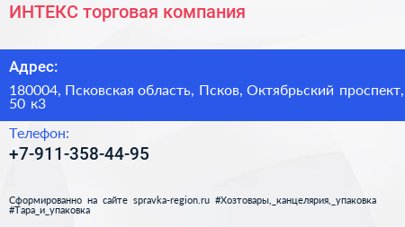 ИНТЕКС, торговая компания по адресу 180004, Псковская область, Псков, Октябрьский проспект, 50 к3 в дальнейшем Организация, размещена в следующих категориях: