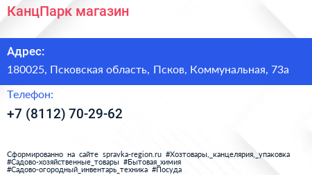 КанцПарк, магазин по адресу 180025, Псковская область, Псков, Коммунальная, 73а в дальнейшем Организация, размещена в следующих категориях:
