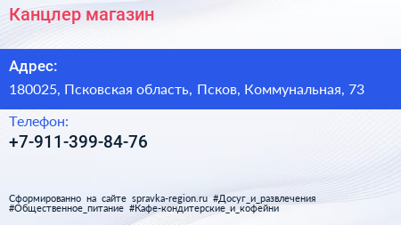 Канцлер, магазин по адресу 180025, Псковская область, Псков, Коммунальная, 73 в дальнейшем Организация, размещена в следующих категориях: