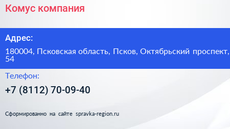 Комус, компания по адресу 180004, Псковская область, Псков, Октябрьский проспект, 54 в дальнейшем Организация, размещена в следующих категориях: