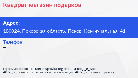 Квадрат, магазин подарков по адресу 180024, Псковская область, Псков, Коммунальная, 41 в дальнейшем Организация, размещена в следующих категориях: