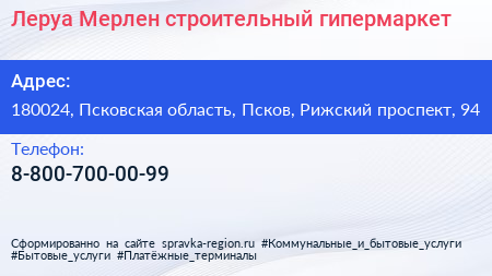 Леруа Мерлен, строительный гипермаркет по адресу 180024, Псковская область, Псков, Рижский проспект, 94 в дальнейшем Организация, размещена в следующих категориях: