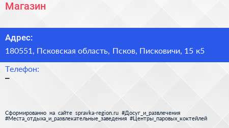 Магазин по адресу 180551, Псковская область, Псков, Писковичи, 15 к5 в дальнейшем Организация, размещена в следующих категориях: