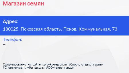 Магазин семян по адресу 180025, Псковская область, Псков, Коммунальная, 73 в дальнейшем Организация, размещена в следующих категориях: