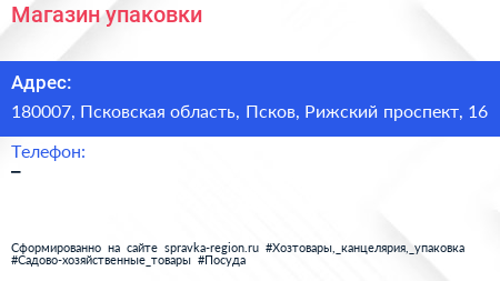 Магазин упаковки по адресу 180007, Псковская область, Псков, Рижский проспект, 16 в дальнейшем Организация, размещена в следующих категориях: