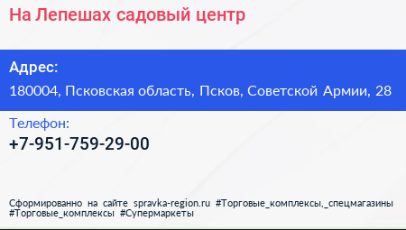На Лепешах, садовый центр по адресу 180004, Псковская область, Псков, Советской Армии, 28 в дальнейшем Организация, размещена в следующих категориях: