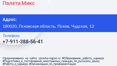 Палета Микс по адресу 180020, Псковская область, Псков, Чудская, 12 в дальнейшем Организация, размещена в следующих категориях: