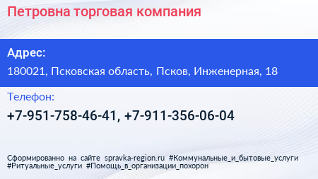 Петровна, торговая компания по адресу 180021, Псковская область, Псков, Инженерная, 18 в дальнейшем Организация, размещена в следующих категориях: