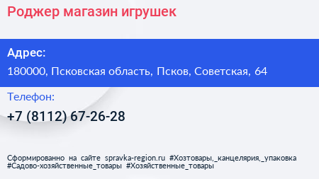 Роджер, магазин игрушек по адресу 180000, Псковская область, Псков, Советская, 64 в дальнейшем Организация, размещена в следующих категориях: