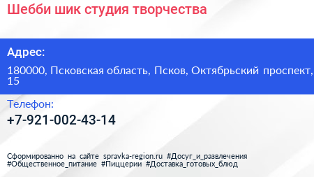 Шебби шик, студия творчества по адресу 180000, Псковская область, Псков, Октябрьский проспект, 15 в дальнейшем Организация, размещена в следующих категориях: