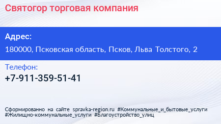Святогор, торговая компания по адресу 180000, Псковская область, Псков, Льва Толстого, 2 в дальнейшем Организация, размещена в следующих категориях:
