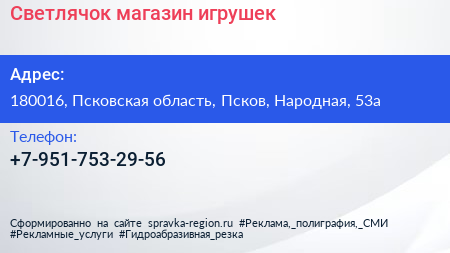 Светлячок, магазин игрушек по адресу 180016, Псковская область, Псков, Народная, 53а в дальнейшем Организация, размещена в следующих категориях: