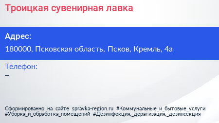 Троицкая, сувенирная лавка по адресу 180000, Псковская область, Псков, Кремль, 4а в дальнейшем Организация, размещена в следующих категориях: