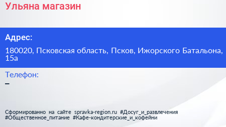 Ульяна, магазин по адресу 180020, Псковская область, Псков, Ижорского Батальона, 15а в дальнейшем Организация, размещена в следующих категориях: