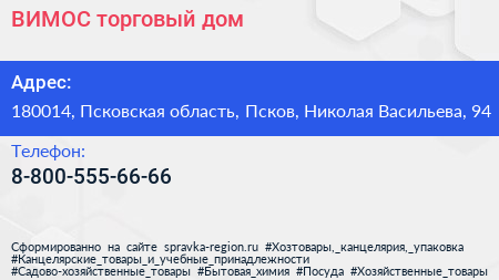 ВИМОС, торговый дом по адресу 180014, Псковская область, Псков, Николая Васильева, 94 в дальнейшем Организация, размещена в следующих категориях: