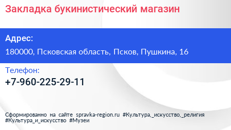 Закладка, букинистический магазин по адресу 180000, Псковская область, Псков, Пушкина, 16 в дальнейшем Организация, размещена в следующих категориях: