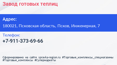 Завод готовых теплиц по адресу 180021, Псковская область, Псков, Инженерная, 7 в дальнейшем Организация, размещена в следующих категориях: