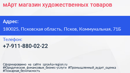 мАрт, магазин художественных товаров по адресу 180025, Псковская область, Псков, Коммунальная, 71Б в дальнейшем Организация, размещена в следующих категориях: