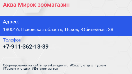 Аква Мирок, зоомагазин по адресу 180016, Псковская область, Псков, Юбилейная, 38 в дальнейшем Организация, размещена в следующих категориях: