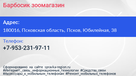 Барбосик, зоомагазин по адресу 180016, Псковская область, Псков, Юбилейная, 38 в дальнейшем Организация, размещена в следующих категориях: