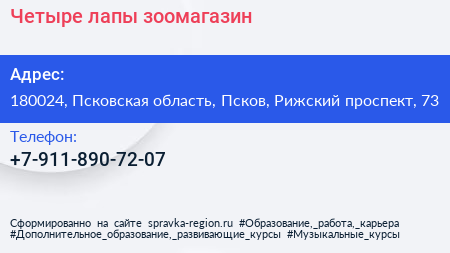 Четыре лапы, зоомагазин по адресу 180024, Псковская область, Псков, Рижский проспект, 73 в дальнейшем Организация, размещена в следующих категориях: