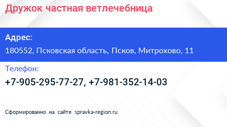 Дружок, частная ветлечебница по адресу 180552, Псковская область, Псков, Митрохово, 11 в дальнейшем Организация, размещена в следующих категориях: