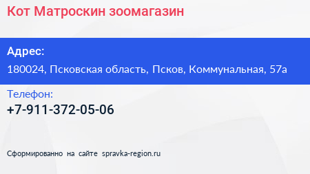 Кот Матроскин, зоомагазин по адресу 180024, Псковская область, Псков, Коммунальная, 57а в дальнейшем Организация, размещена в следующих категориях: