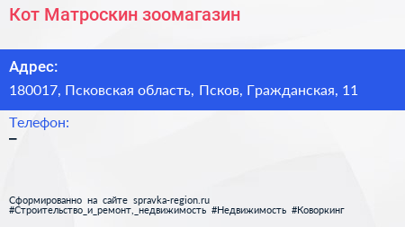 Кот Матроскин, зоомагазин по адресу 180017, Псковская область, Псков, Гражданская, 11 в дальнейшем Организация, размещена в следующих категориях: