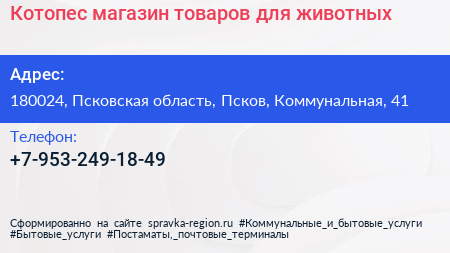 Котопес, магазин товаров для животных по адресу 180024, Псковская область, Псков, Коммунальная, 41 в дальнейшем Организация, размещена в следующих категориях: