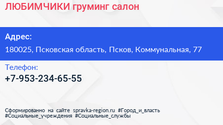 ЛЮБИМЧИКИ, груминг-салон по адресу 180025, Псковская область, Псков, Коммунальная, 77 в дальнейшем Организация, размещена в следующих категориях: