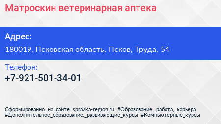 Матроскин, ветеринарная аптека по адресу 180019, Псковская область, Псков, Труда, 54 в дальнейшем Организация, размещена в следующих категориях: