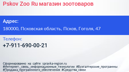Pskov-Zoo.Ru, магазин зоотоваров по адресу 180000, Псковская область, Псков, Гоголя, 47 в дальнейшем Организация, размещена в следующих категориях: