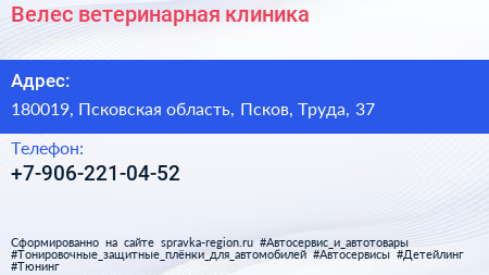 Велес, ветеринарная клиника по адресу 180019, Псковская область, Псков, Труда, 37 в дальнейшем Организация, размещена в следующих категориях: