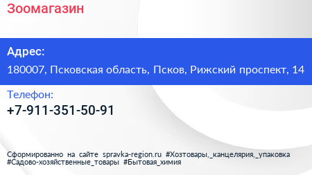 Зоомагазин по адресу 180007, Псковская область, Псков, Рижский проспект, 14 в дальнейшем Организация, размещена в следующих категориях: