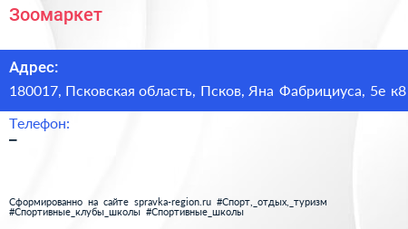 Зоомаркет по адресу 180017, Псковская область, Псков, Яна Фабрициуса, 5е к8 в дальнейшем Организация, размещена в следующих категориях: